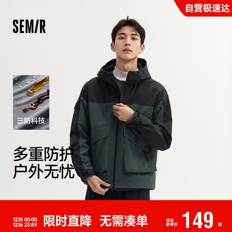 森馬(Semir)三防外套男秋季戶外撞色拼接連帽夾克大口袋工裝上衣101524108116