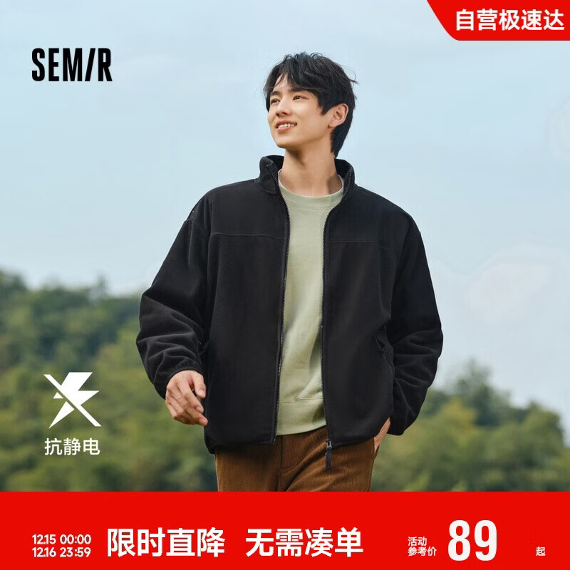 森馬(Semir)抗靜電夾克男搖粒絨毛絨外套寬松連帽冬裝情侶款 黑色90001 S