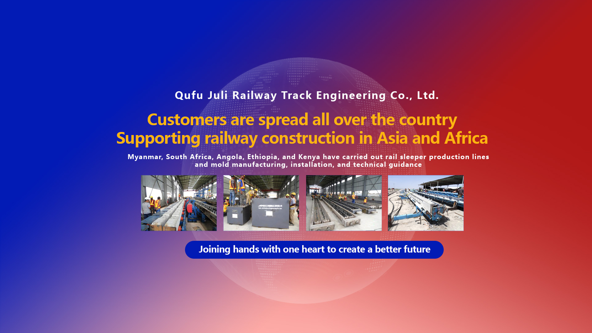 Qufu Juli Railway Track Engineering Co., Ltd. was founded in 2001 and is located at the southern end of Chuangye Avenue in Taiwan Industrial Park, eastern Qufu. Located to the east of the Beijing Shanghai high-speed railway, to the south of the Ridong expressway, to the west of the Jingfu expressway, and to the north of the intersection of National Highways 104 and 327, it enjoys a prime geographical location. The factory covers an area of over 200 acres, with a building area of over 30000 square meters and 350 sets of various mechanical and power equipment.……